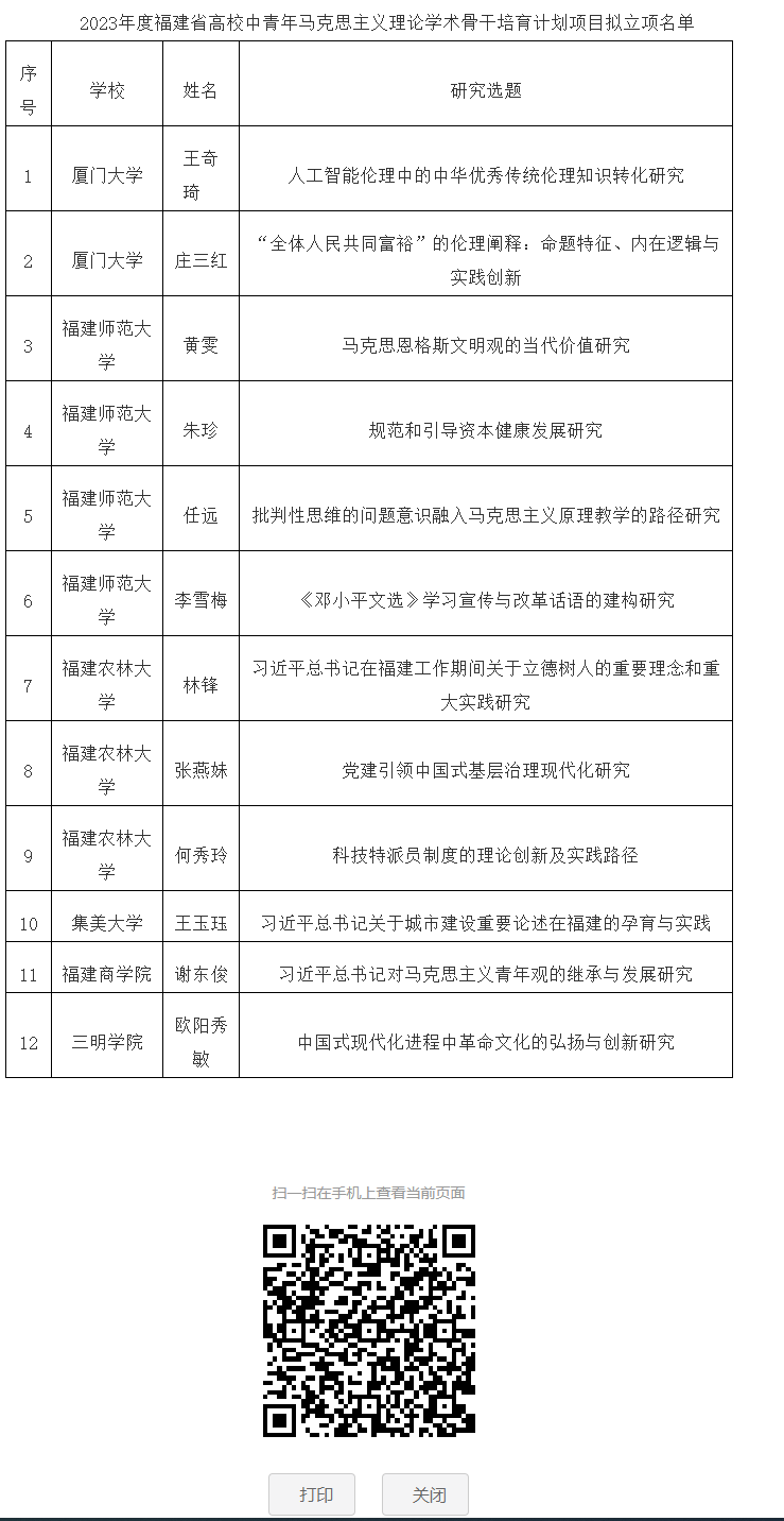 喜讯: 根据《中共福建省委宣传部、中共福建省委教育工委、福建省社会科学界联合会关于实施2023年度福建省高校中青年马克思主义理论学术骨干培育计划项目申报工作的通知》(闽委教思〔2023〕19号)要求,经有关高校推荐、专家评审,拟立项厦门大学王奇琦的“人工智能伦理中的中华优秀传统伦理知识转化研究”等12项高校中青年马克思主义理论学术骨干培育计划项目,贝博官网谢东俊老师习近平总书记对马克思主义青年观的继承与发展研究获得立项。