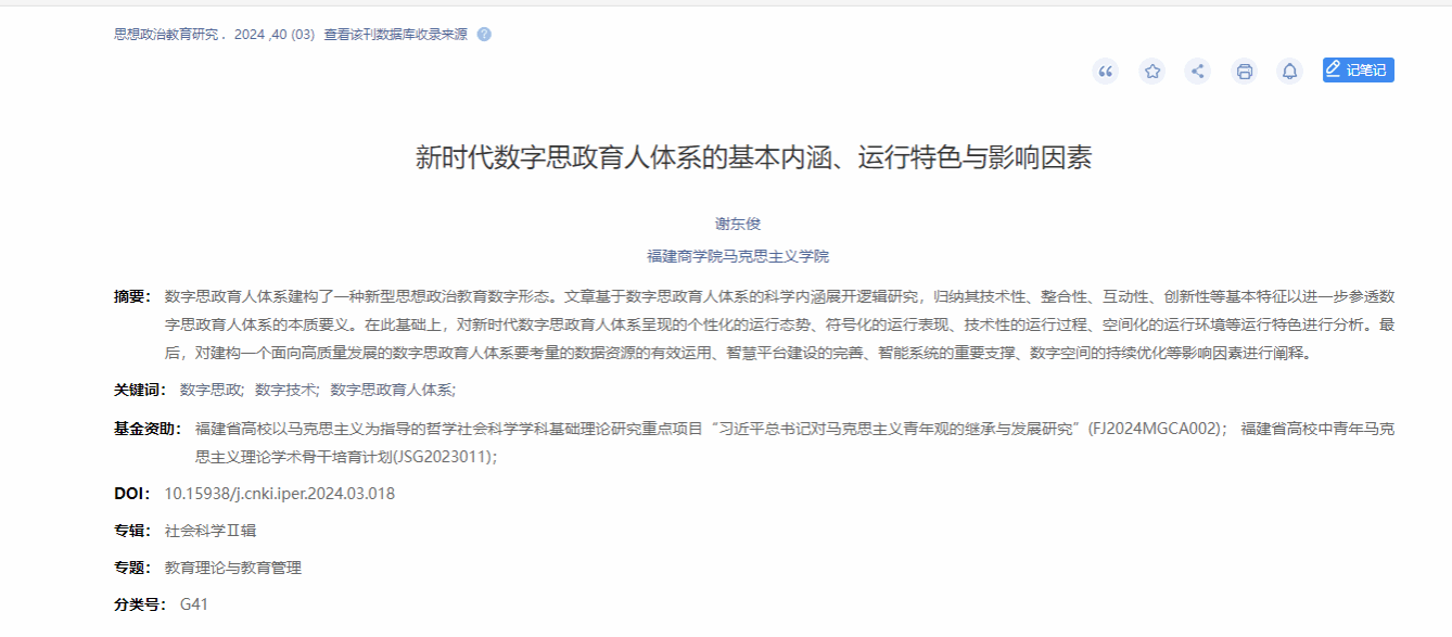 近日,贝博官网谢东俊副院长在北大核心期刊《思想政治教育研究》发表文章《新时代数字思政育人体系的基本内涵、运行特色与影响因素》