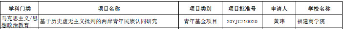 2020年3月20日,教育部社会科学司公布的《教育部社科司关于2020年度教育部人文社会科学研究一般项目立项的通知》文件中,贝博官网黄玮博士申报的项目《基于历史虚无主义批判的两岸青年民族认同研究》,历经多次的修改,不断打磨,功夫不负有心人,最终获得教育部社科青年基金立项。