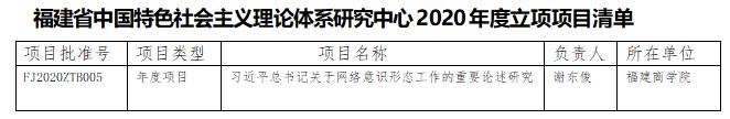 近日,中共福建省委宣传部公布了福建省中国特色社会主义理论体系研究中心2020年立项项目清单。BB贝博艾弗森官方网站谢东俊老师主持申报的《习近平总书记关于网络意识形态工作的重要论述研究》(项目编号:FJ2020ZTB005)被遴选为福建省中国特色社会主义理论体系研究中心年度项目。
