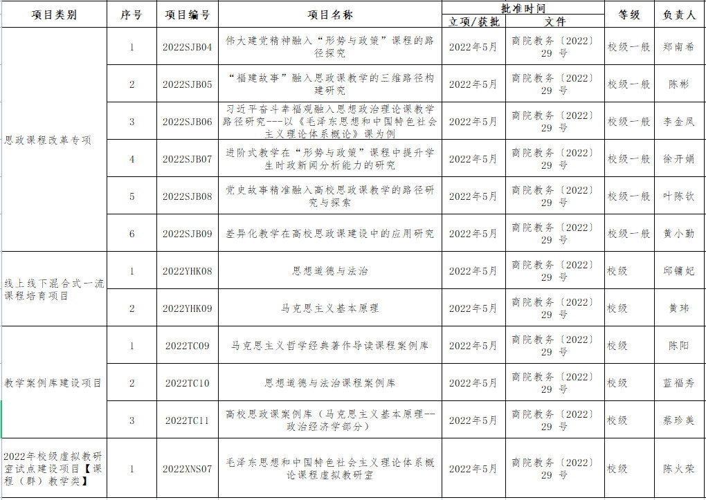 近期,关于公布2022年本科教育教学改革研究项目等立项名单的通知(商院教务〔2022〕29 号),贝博官网思政课程改革专项立项6项,线上线下混合式一流课程培育项目立项2项,教学案例库建设项目立项3项,虚拟教研室试点建设项目【课程(群)教学类】立项1项。