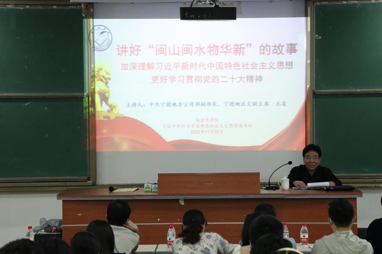 闽山闽水物华新,“习言习语”催人进。11月22日晚,中共宁德地委宣传部原副部长、原宁德地区文联主席王凌研究员受邀莅临我校,为我校师生作了题为《讲好“闽山闽水物华新”的故事,加深理解习近平新时代中国特色社会主义思想,更好学习贯彻党的二十大精神》的专题讲座。校党委副书记吴访益,BB贝博艾弗森官方网站、机关党委负责同志,学校习近平新时代中国特色社会主义思想学生读书社、教职工读书社社员代表参加。
