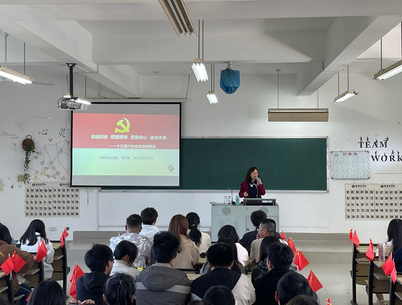12月7日下午,福建幼儿师范高等专科学校BB贝博艾弗森官方网站院长伊文婷教授应邀到我校马尾校区开展题为“总结历史,把握规律,坚定信心,走向未来——党的十九届六中全会精神解读”的讲座,马尾校区校马列经典著作读书社指导老师和全体社员参加了此次讲座。