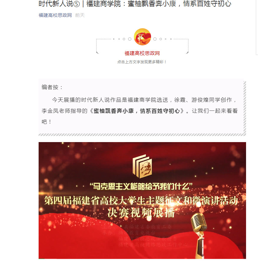2021年4月7日,福建高校思政网展出《蜜柚飘香奔小康,情系百姓守初心》微演讲视频。该微视频由BB贝博艾弗森官方网站李金凤老师指导,徐霞、游俊煌两位学生创作。