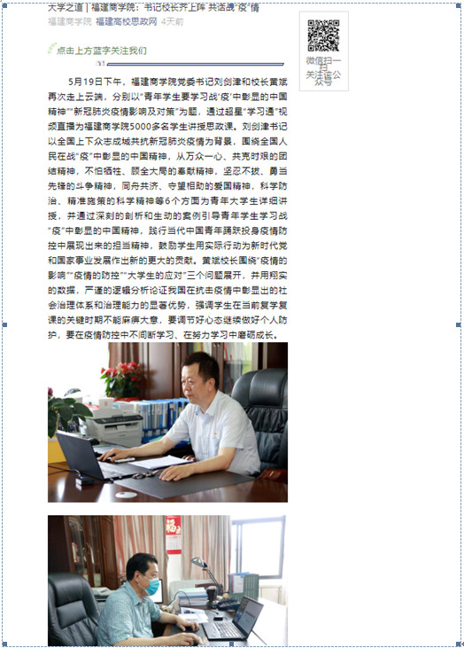 2020年5月23日,福建高校思政网以《大学之道 福建商学院书记校长齐上阵 共话战“疫”情》为题,报道我校书记校长分别以“青年学生要学习战‘疫’中彰显的中国精神”“新冠肺炎疫情影响及对策”为题,通过超星“学习通”视频直播为我校5000多名学生讲授思政课的特色做法。