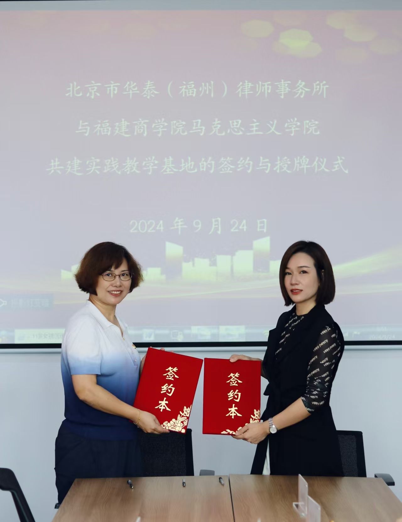 为深入贯彻落实习近平总书记关于“大思政课”的重要指示批示精神,按照教育部关于开展高校与“大思政课”实践教学基地结对行动的部署要求,9月24日上午,贝博官网与北京市华泰(福州)律师事务所共建“大思政课”实践教学基地签约揭牌仪式在北京市华泰(福州)律师事务所举行。律所执行主任方云香、执行副主任兼党务负责人张江波、贝博官网党委书记、院长林萍及律所高级合伙人、部分老师参加仪式。