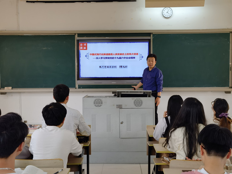 为进一步学习贯彻党的十九届六中全会精神,深刻领悟党百年奋斗的重要经验和教训,使青年学生认识到党和国家发展所处的新的历史方位和前进方向,坚定青年学生跟党走中国特色社会主义道路的信念,5月18日晚,BB贝博艾弗森官方网站陈火荣副教授应邀在马尾校区诚信楼201教室开展“中国式现代化新道路是人类发展史上的伟大创造”主题宣讲活动,校马列经典著作读书社社员参与学习。