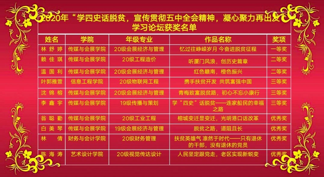 论坛以演讲比赛的形式进行,参赛选手围绕主题阐述学习党的十九届五中全会精神、“四史”和《习近平在福建》等系列采访实录的心得体会;讲述农村、农民在党的领导下的脱贫攻坚历史、先进典型以及干部群众扶贫济困的感人事迹、奋斗精神,展现干部群众同心同德共奔小康的良好精神风貌。参赛选手精神饱满,话身边人,道国家事,用一个个感人的小故事展现国家发展的大历史,鼓励、引导青年学子积极投身社会主义现代化强国的建设中,以青春担当创造美好生活。经过将近两个小时的激烈角逐,传媒与会展学院20级会展经济与管理专业林舒婷同学获得本次学习论坛决赛一等奖。活动中,BB贝博艾弗森官方网站院长林萍对比赛作了点评并针对丰富学习论坛形式等提出建议。