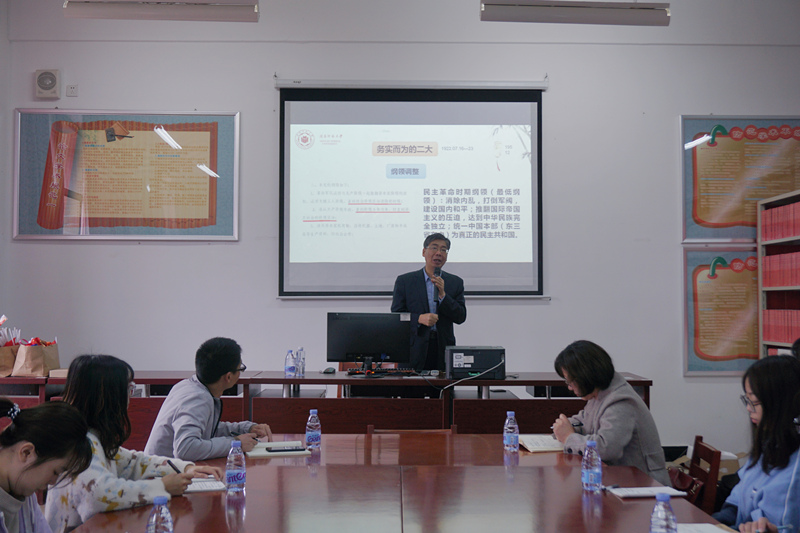 陈再生教授从“为何学”“学什么”“怎么学”三个方面深入解读了习近平总书记在党史学习教育动员大会上的讲话,他详细分析了中共一大至中共七大召开的历史背景、主要内容、历史地位以及经验启示等,阐述了新民主主义革命时期党的发展历程以及党领导人民在革命斗争中取得的辉煌成就。陈再生教授表示,学习党史可以为我们提供“仰望星空路高远、脚踏实地路宽广”“求同存异结伴行、并肩战斗开新局”等经验启示,更好指导我们的学习生活。