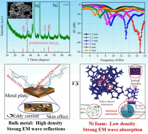 金属基材料在吸波领域的应用受限于其自身的两个缺陷,一是过高的电导率引起的电磁波在其表面强烈的反射,二是自身的高密度难以满足目前轻质吸波材料的需求。尽管通过纳米尺寸的金属材料设计或将金属氧化物、碳材料与金属材料进行复合可以在一定程度上解决上述问题,但是由此而引起的问题诸如纳米金属粒子团聚、被氧化而引起的吸波性能衰退以及金属复合材料复杂的制备过程同样制约着高效、轻质金属基吸波材料的进一步发展。基于上述问题,本项目通过一种“发面法”及后续的退火过程制备出了轻质的泡沫镍材料,并创新性地将金属氧化物原位生长在泡沫镍上,最终得到了轻质、高效的金属基吸波材料。将金属材料设计成多孔泡沫结构不仅能够极大地降低金属材料的密度,而且引入的气泡可以作为电磁波在材料内部的传输通道,有效的解决了电磁波在金属材料表面的反射问题。为了进一步补充材料的电磁损耗能力,氧化镍/铁酸镍通过原位生长的方式在泡沫镍表面形成,为复合材料提供了较强的介电损耗能力。最终,在泡沫结构与金属/氧化物组分的协同作用下,造就了泡沫镍基材料优异的吸波性能。该研究为新型轻质、高效的金属基吸波材料的制备提供了新的思路。