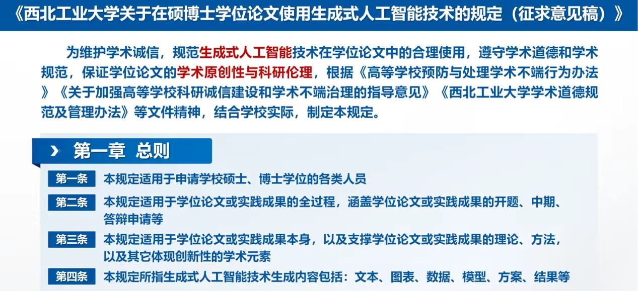 研究生院介绍了《万象城娱乐awc线路关于在硕博士学位论文使用生成式人工智能技术的规定》(征求意见稿)。该文件明确了生成式人工智能技术的使用规范与边界、标注与声明要求、检测与审核流程、违规处理办法等。