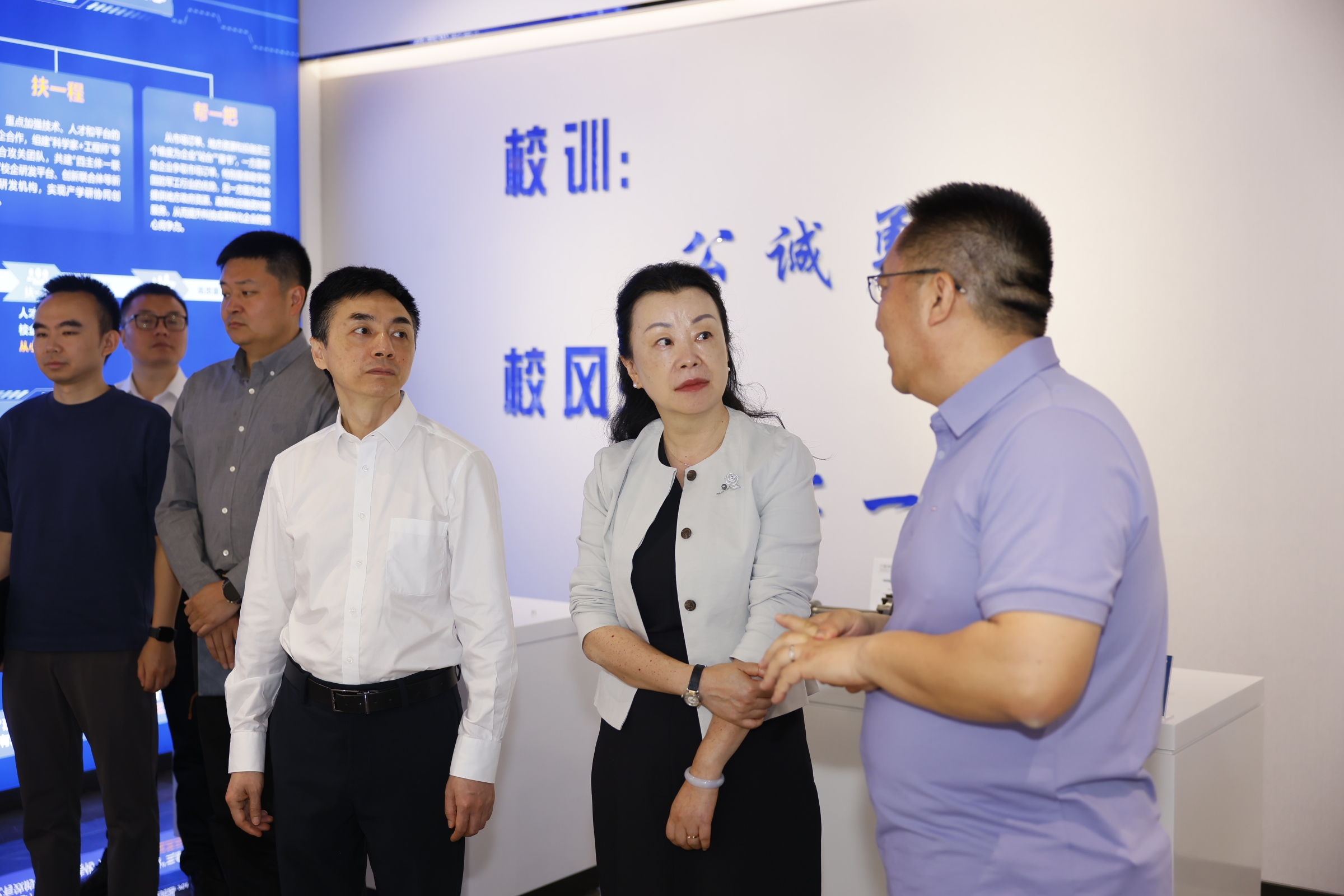 调研期间,靳敏、李秋实一行还进行了分组调研,并参观了学校学校科技馆和科技成果转化展厅。