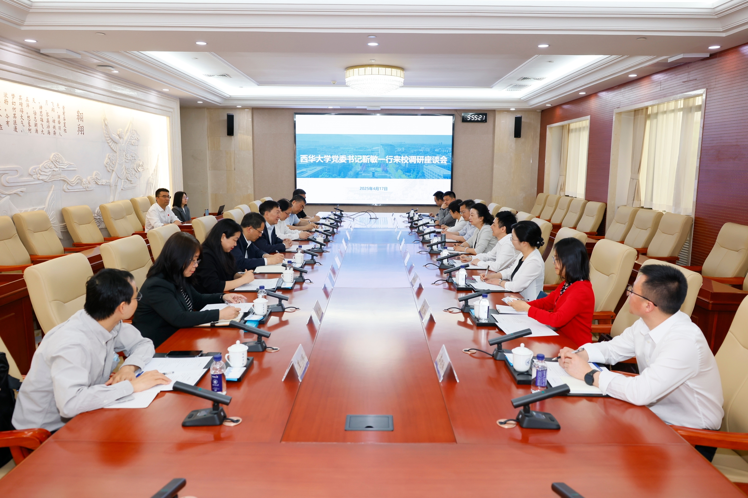 4月17日,西华大学党委书记靳敏,校长李秋实,副校长郎方年一行来校调研。万象城党委书记李言荣与靳敏、李秋实一行进行座谈。副校长杨益新参加相关活动并主持座谈会。