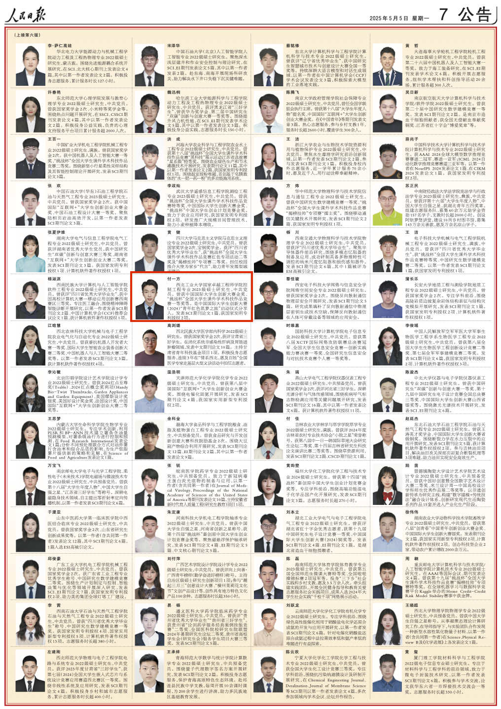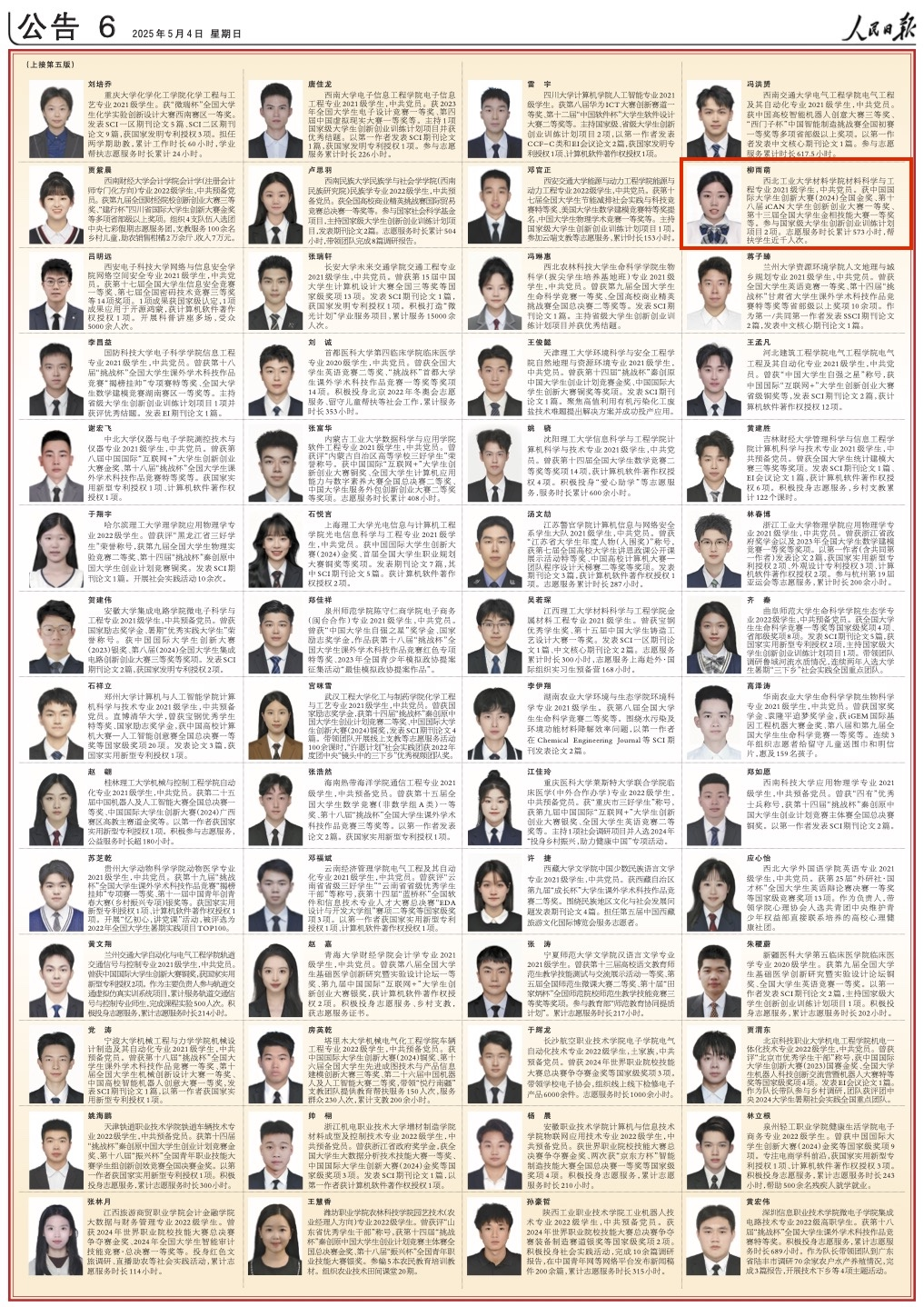 5月4日和5日,《人民日报》分别发布了《2023-2024学年度本专科生国家奖学金获奖学生代表名录》和《2024年研究生国家奖学金获奖学生代表名录》,万象城娱乐awc线路材料学院本科生柳雨萌和国家卓越工程师学院硕士研究生付一方,荣登该名录!目前,万象城已连续三年本科生和研究生获奖学生代表双双登上该名录!