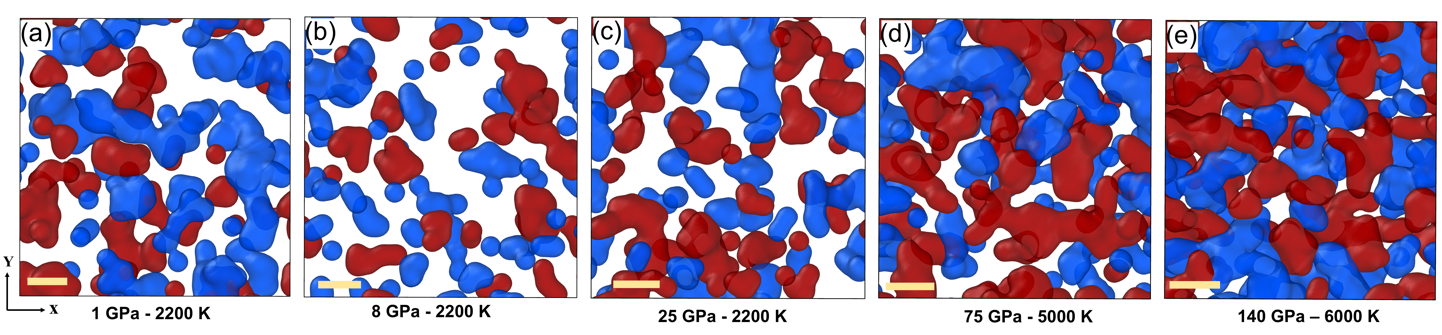 该团队采用深度学习分子动力学模拟,首次发现硅酸镁液相中存在显著的结构异质性特征,表现为富镁与富硅区域空间分布的相互排斥性。研究采用高斯密度场方法对结构异质性区域进行识别与量化,进一步揭示了结构异质性区域在空间分布上的非均匀特征及其在高压条件下的演化规律。发现,随着压力由低到高,结构异质性区域的尺度与分布趋势均呈现非单调变化:区域尺度先减小而后增大,分布先变松散而后紧实,其中拐点均出现在约8GPa。该现象与前人报道的硅酸镁液相黏度异常行为相似——黏度在5-8GPa范围内出现极小值。