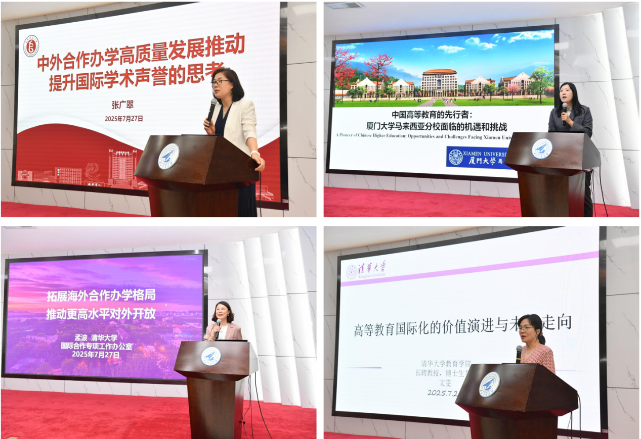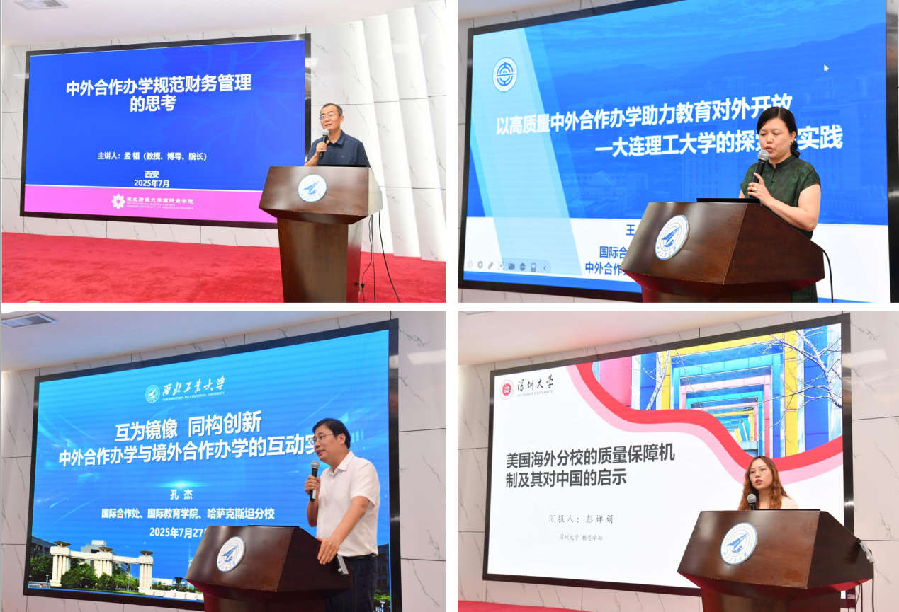 长春师范大学党委副书记张广翠,厦门大学马来西亚分校副校长张颖,清华大学国际合作专项工作办公室主任孟波,清华大学教育学院副院长文雯,中外合作办学联席会秘书长、东北财经大学国际商学院院长孟韬,大连理工大学国际合作与交流处处长王珏,万象城娱乐awc线路国际合作处处长、国际教育学院院长兼哈萨克斯坦分校校长孔杰,深圳大学教育学部助理教授彭婵娟分别就最新理论研究和涉外办学实践作报告。