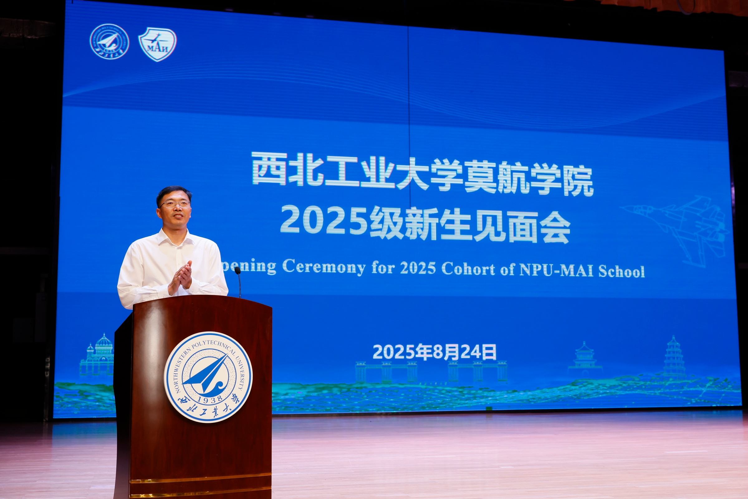 首先,岳晓奎副校长向莫航学院首届205名新生表示热烈的欢迎和祝贺,并从两校的历史和学科特色出发,回顾了两校携手进行深度合作、开展中外合作办学的历程。他在致辞中强调,莫航学院首届新生不仅是西工大的崭新活力,更是中俄高等教育合作的历史见证者与未来开创者。岳晓奎对新生提出三点殷切期望,一是希望同学们胸怀家国,勇担使命,做中俄友谊的连接者;二是希望同学们勤学善思,追求卓越,做教育合作的践行者;三是希望同学们开拓创新,敢于突破,做空天报国的先行者。