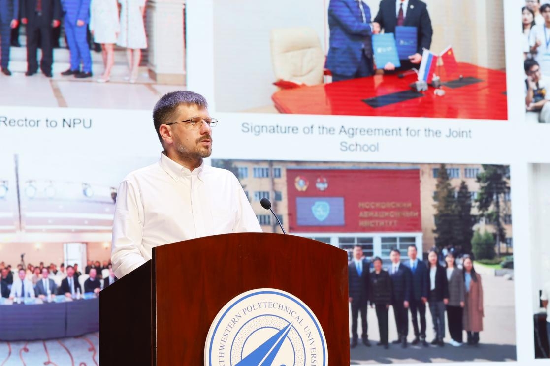 叶夫根尼·涅列廷代表莫斯科航空学院进行致辞。在致辞中他介绍了莫斯科航空学院的历史沿革、办学特色,并回顾了两校自建立合作关系以来所取得的重要成果。围绕两校合作办学的四个核心,介绍了学生在校期间将接触到的未来科研与工程实践方向。他强调,空天探索是人类共同的事业,跨越国界、连接梦想,他希望同学们以追求卓越的精神投身科学探索与技术实践,不断提升自身的创新能力与工程实践水平,努力成为中俄两国科技与文化合作的桥梁。他表示,此次莫航学院首届新生见面会,标志着两所学校在人才培养合作领域的关键里程碑。他勉励同学们珍惜中俄高校合作搭建的宝贵学习平台,不仅要掌握扎实的专业知识与技能,更要勇于探索空天科学的无限可能。