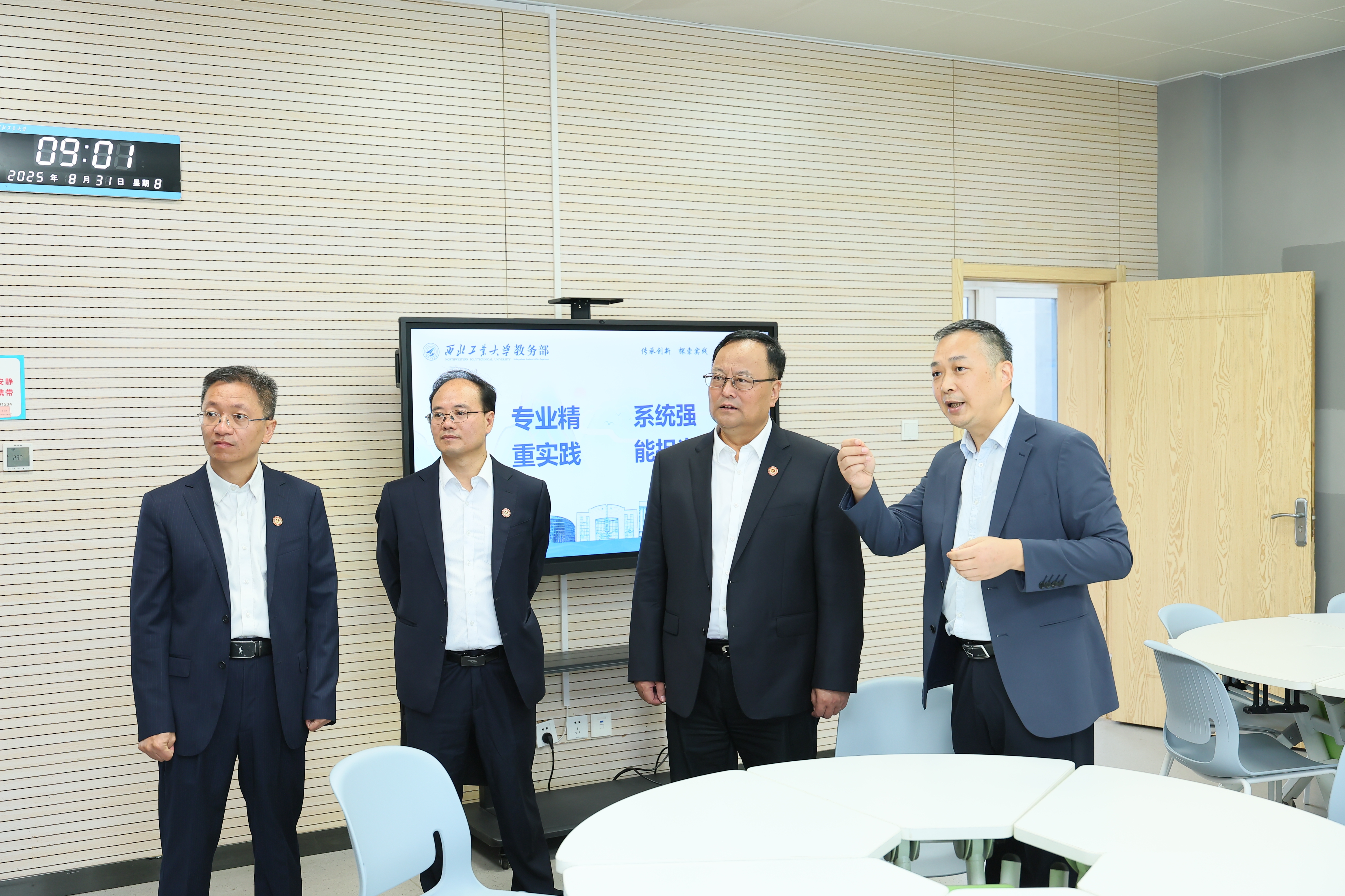 在教学东楼,宋保维听取了教务部关于新学期教学准备、智慧教学设备技术升级、人工智能赋能教学案例以及“总师型”人才培养教学创新空间建设情况等工作汇报。他强调,要持续推进人工智能赋能教育教学工作,结合课程实际和“总师型”人才培养需求,加强人工智能技术在课堂教学等方面的应用,持续提升教师数智素养和教学能力,不断提升教学质量。