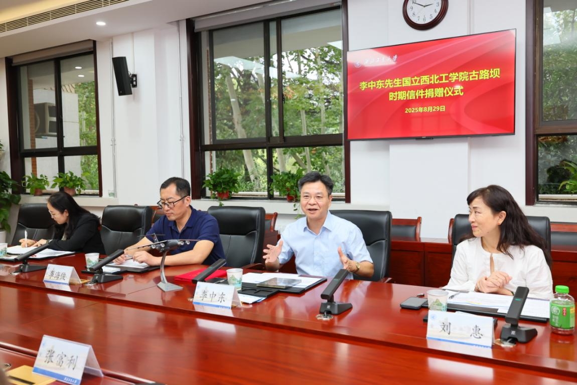 张富利代表学校接受捐赠并向李中东先生颁发了捐赠证书。他表示,本次获赠的这两件珍贵史料,是国立西北工学院在抗战时期坚持教育救国的历史见证,是深入研究抗战时期中国高等工程教育发展的第一手资料,是弘扬伟大爱国主义精神、伟大抗战精神的生动素材。学校将结合纪念中国人民抗日战争暨世界反法西斯战争胜利80周年,讲好史料背后的故事,让广大青年学生能够直观地触摸历史、感知历史,从先辈的事迹中汲取精神力量,让这份宝贵的记忆和精神血脉得以永续传承。