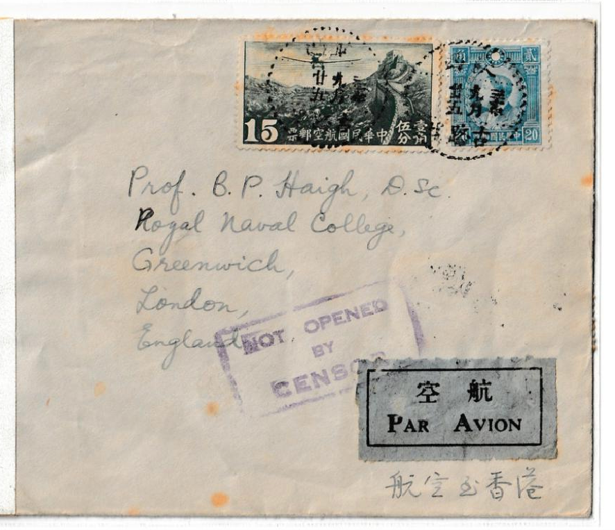 1941年9月25日古路坝寄英国伦敦格林威治皇家海军学院(Royal Naval College,Greenwich London) 国际航空信,贴8分朱执信像邮票五枚,20分黄兴像邮票一枚和15分长城图航空票一枚,寄出地址落款为“陕西城固国立西北工学院 辛一心缄”中英文。
