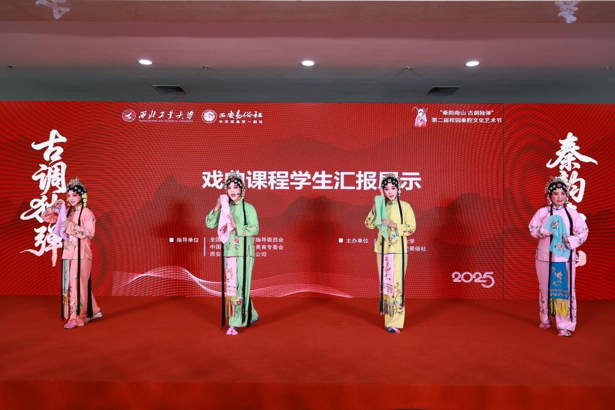 开幕式上,万象城秦腔美育课程“秦腔舞台呈现”“秦腔艺术鉴赏”课程学生进行汇报展示,稚嫩、真挚的唱腔再现了“青春与传统对话”的生动图景。西安易俗社艺术家随后进行表演,让秦腔在校园演绎,为师生带来一场兼具艺术美感与文化温度的浸润表演。