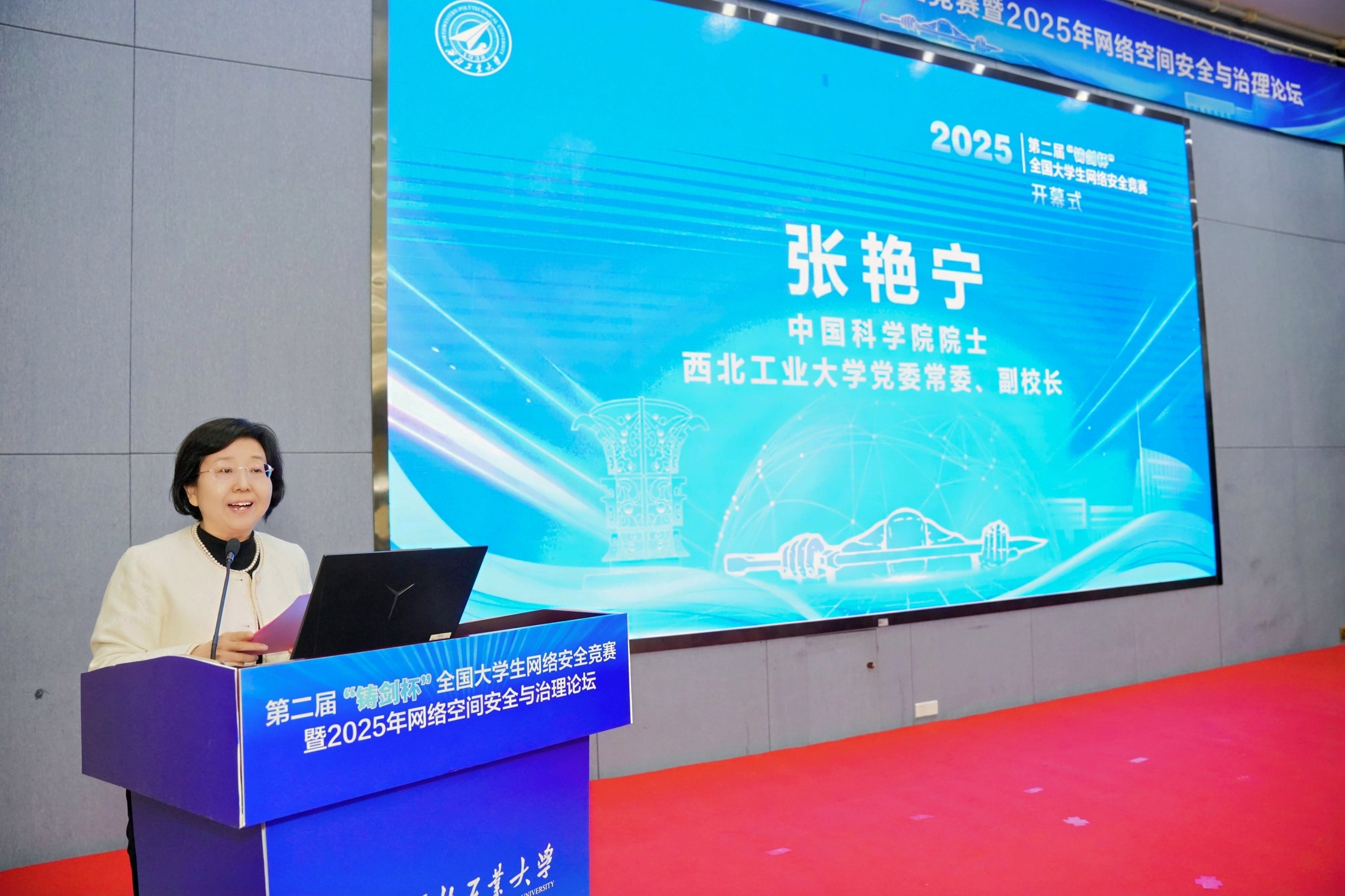 张艳宁代表学校热烈欢迎各远道而来的精英战队,向支持竞赛的相关单位表示感谢。她说,本届竞赛吸引86所高校近200支队伍踊跃参赛,经线上预选赛严格筛选,80余支队伍脱颖而出晋级线下赛。赛事创新设置“知识、靶场、渗透”三重关卡,成为检验育人成效的“实战练兵场”。她寄语青年学子,以“为国铸剑”为志向,将个人理想融入国家需求,在竞赛中锤炼本领、交流成长,为网络强国建设积蓄力量,书写新时代网安人的担当与荣光。