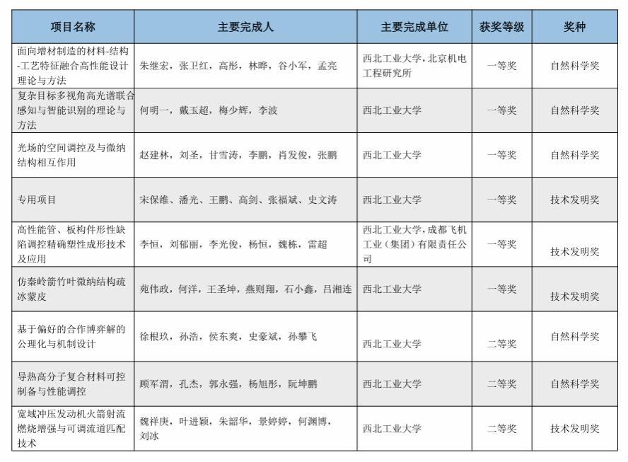 朱继宏教授主持完成的“面向增材制造的材料-结构-工艺特征融合高性能设计理论与方法”,何明一教授主持完成的“复杂目标多视角高光谱联合感知与智能识别的理论与方法”,赵建林教授主持完成的“光场的空间调控及与微纳结构相互作用”分别荣获陕西省自然科学一等奖;宋保维教授主持完成的专用项目,李恒教授主持完成的“高性能管、板构件形性缺陷调控精确塑性成形技术及应用”,苑伟政教授主持完成的“仿秦岭箭竹叶微纳结构疏冰蒙皮”分别荣获陕西省技术发明一等奖。