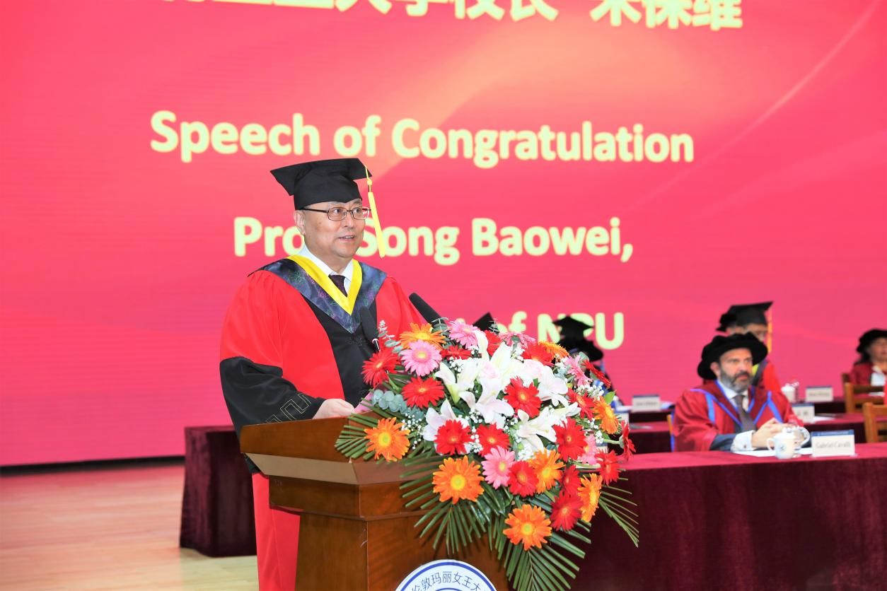 最后,在中英双方母校的认可和祝福下,代富平书记宣读本次毕业生名单和学位等级。宋保维教授、Colin Bailey教授、范晓丽教授和Gabriel Cavalli教授共同为毕业生颁发毕业证书、拨穗。