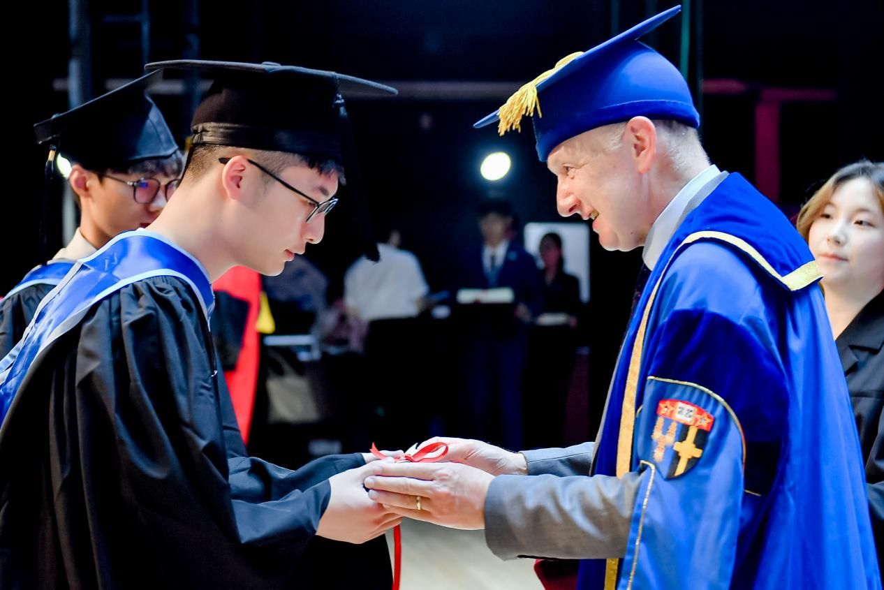 感恩师长后,Colin Bailey校长为邓欣茹博士颁发博士学位证书。邓欣茹博士于2019年在伦敦玛丽女王大学获得了材料科学博士学位,毕业后被聘任为QMES助理教授。她完美演绎了两所大学、两座城市、两个国家依托玛丽女王工程学院这一纽带共同追求学术卓越的友谊大使角色。