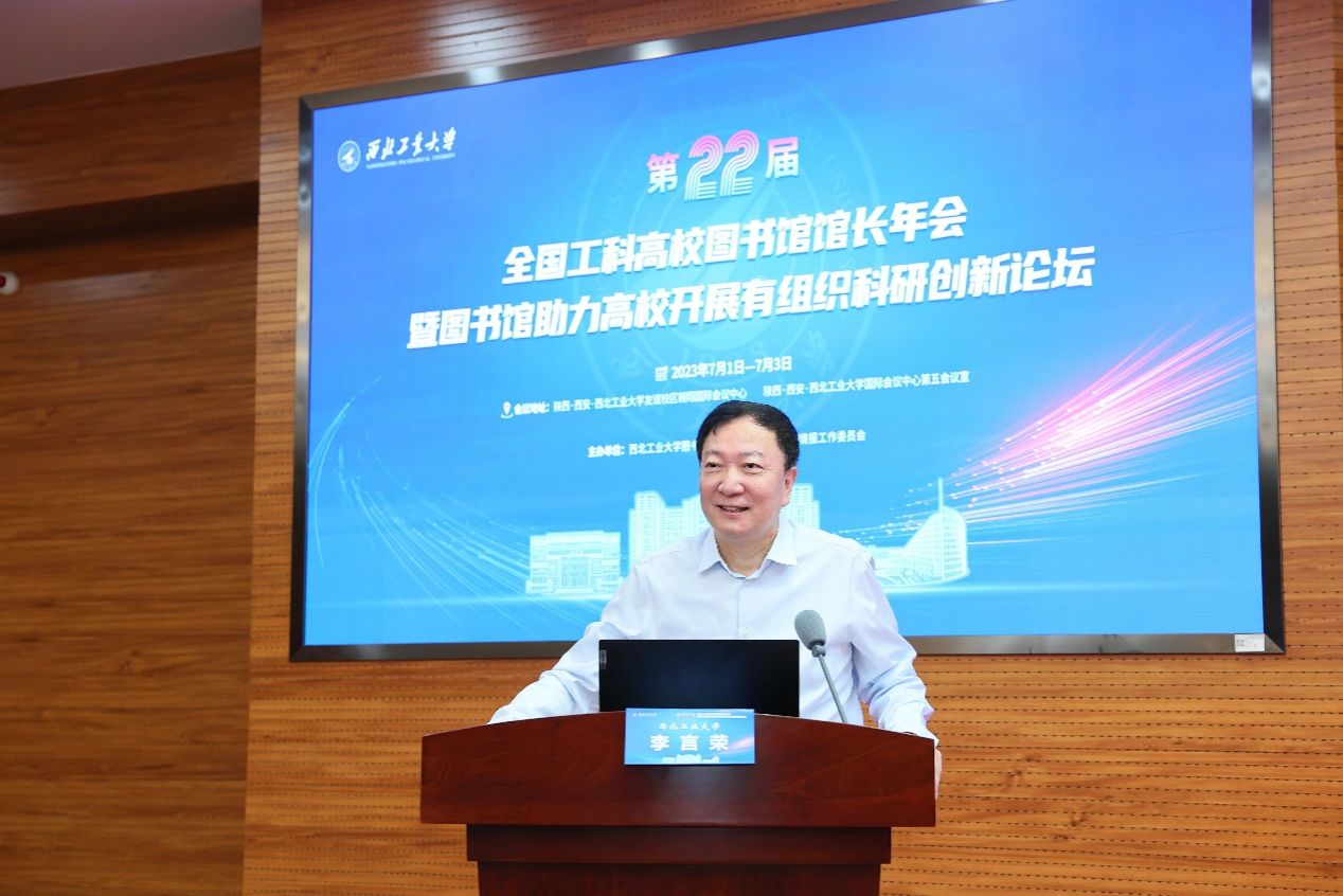 李言荣对各位图书馆馆长、专家学者的到来表示欢迎,对大家长期以来对西工大的关心和支持表示感谢。他说,一所一流大学应该有一流的“四馆”,也就是一个好的图书馆、一个好的校史馆、一个好的体育馆和一个好的博物馆,其中图书馆是核心。往往图书馆在大学中有很强的辨识度、也是地理上的坐标中心。大学图书馆既是保障教学科研的重要文献资源中心,也是营造良好校风学风和校园文化氛围的神圣殿堂,还是服务学者、学术、学生的综合信息平台。在当前我国加快建设教育强国的背景下,高校图书馆要坚持与学校发展战略和目标相衔接,与时代发展的要求和广大师生的需求相匹配,紧密围绕建设世界一流大学的目标,在主动融入人才培养全过程、深度融入科学研究和学科建设全领域、整合服务资源等方面,努力打造具有中国特色的一流大学图书馆,特别是工科图书馆对国家科技自立自强、对有组织的科研要发挥更大的作用。希望与会馆长、专家充分利用本次论坛搭建的平台,建言献策、交流互鉴,为服务教育强国建设和高水平科技自立自强贡献智慧和力量。