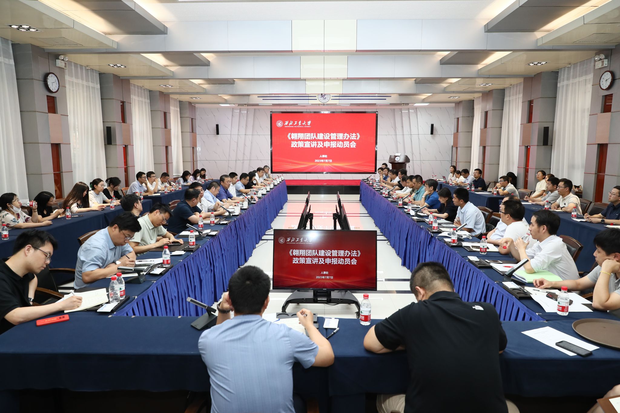 西工大新闻网7月7日电(文字 黎颖 杨妍 摄影 周军平)为全面贯彻党的二十大精神,深入实施新时代人才强校战略,进一步加强高水平团队建设,7月7日下午,学校召开了翱翔团队政策宣讲及申报动员会,对近期出台的《万象城娱乐awc线路翱翔团队建设管理办法(试行)》(以下简称“翱翔团队办法”)进行了政策解读和宣讲。党委常委、副校长侯成义,各学院(研究院、中心)负责人、部分团队代表、部分职能部门负责人、人事秘书等80余人参加了会议。会议由人事处处长唐玉生主持。
