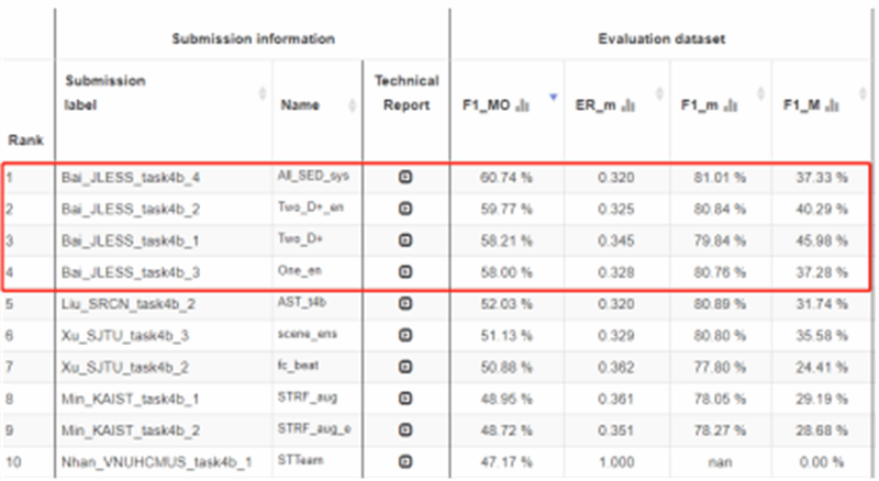 西工大新闻网8月14日电(白吉生 尹涵 白婧熠)近日,第九届国际权威声学场景和事件检测及分类竞赛(Detection and Classification of Acoustic Scenes and Events, DCASE 2023)在其官方网站上公布了比赛结果。万象城娱乐awc线路航海学院-迅声环境声音感知联合实验室(JLESS)算法团队在竞赛任务4B(基于软标签的声音事件检测)中获得国际第一名的好成绩!这也是万象城首次获得该比赛项目第一名。