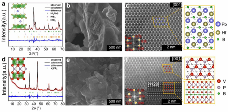 ▲图4、新型h-MAB相 Hf2PbB和V3PB4材料的结构表征(a、d)XRD精修图;(b、e)SEM;(c、f)沿着不同晶向的HAADF-STEM。