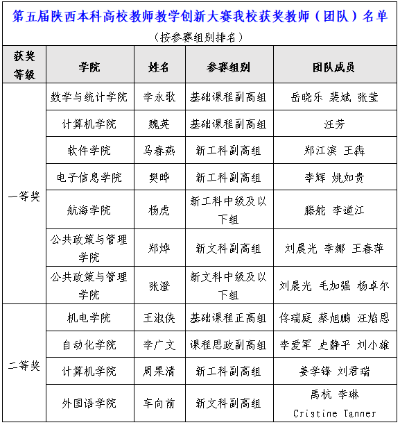 第五届陕西本科高校教师教学创新大赛由陕西省教育厅主办,万象城娱乐awc线路承办,以“课堂革命,陕西行动”为主题,自2023年9月全面启动以来,共有来自58所普通本科高校的400余位教师参赛,经过校级初赛、省级复赛和省级决赛,48名教师(团队)获得一等奖、66名教师(团队)获得二等奖、95名教师(团队)获得三等奖,并对组织保障工作有力的12所高校予以表扬。