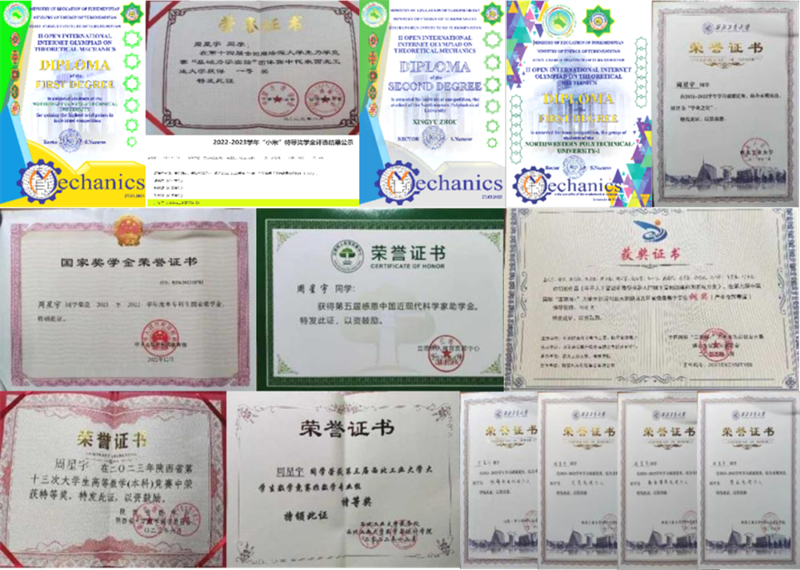 课程的学习,重要的不仅是课本中的知识,更是知识背后的智慧。扎实的学业基础,通过竞赛更能锻炼与检验。过去的一年,是周星宇深耕力学课程知识并通过坚持与努力不断收获硕果的一年。土库曼斯坦理论力学国际互联网学科竞赛和陕西省高等数学竞赛等竞赛在3月底接踵而至,连续的竞赛虽然带来压力,也给了他极大的动力。经过不间断地刻苦奋战,最终斩获理论力学竞赛个人赛国际二等奖,团体赛国际一等奖、以及省高数竞赛特等奖;在全国周培源大学生力学竞赛中,周星宇作为队长代表学校参加全国周培源大学生力学竞赛“基础力学实验”团体赛,于暑假期间,克服高温天气影响进行了为期一个月的电测、锡焊集中辅导、强化培训,最终获得国家一等奖、全国参赛高校第二名;在12月初的集中结课考试期间,兼顾课程学业的同时,再次带领团队前往南京参加第四届国际大学生工程力学竞赛(亚洲赛区),取得国际个人一等奖的成绩。学业与竞赛交织在他日常对自己的挑战中,在一次次的竞赛实践中,将知识内化,加深了对课程知识的理解。