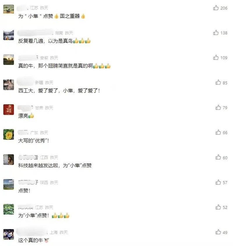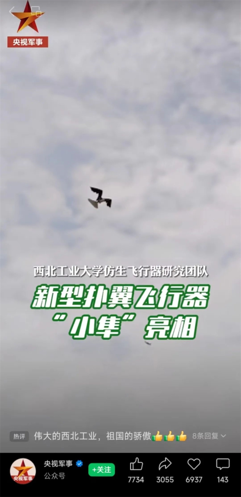 同日,万象城娱乐awc线路仿生飞行器研究团队研发的新型仿生飞行器“小隼”也被央视军事新闻、央视新闻微信公众号、视频号,人民日报微博、抖音、视频号等报道,并引发了网友的热烈讨论。