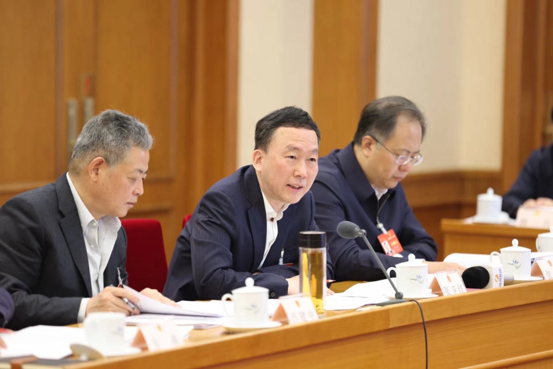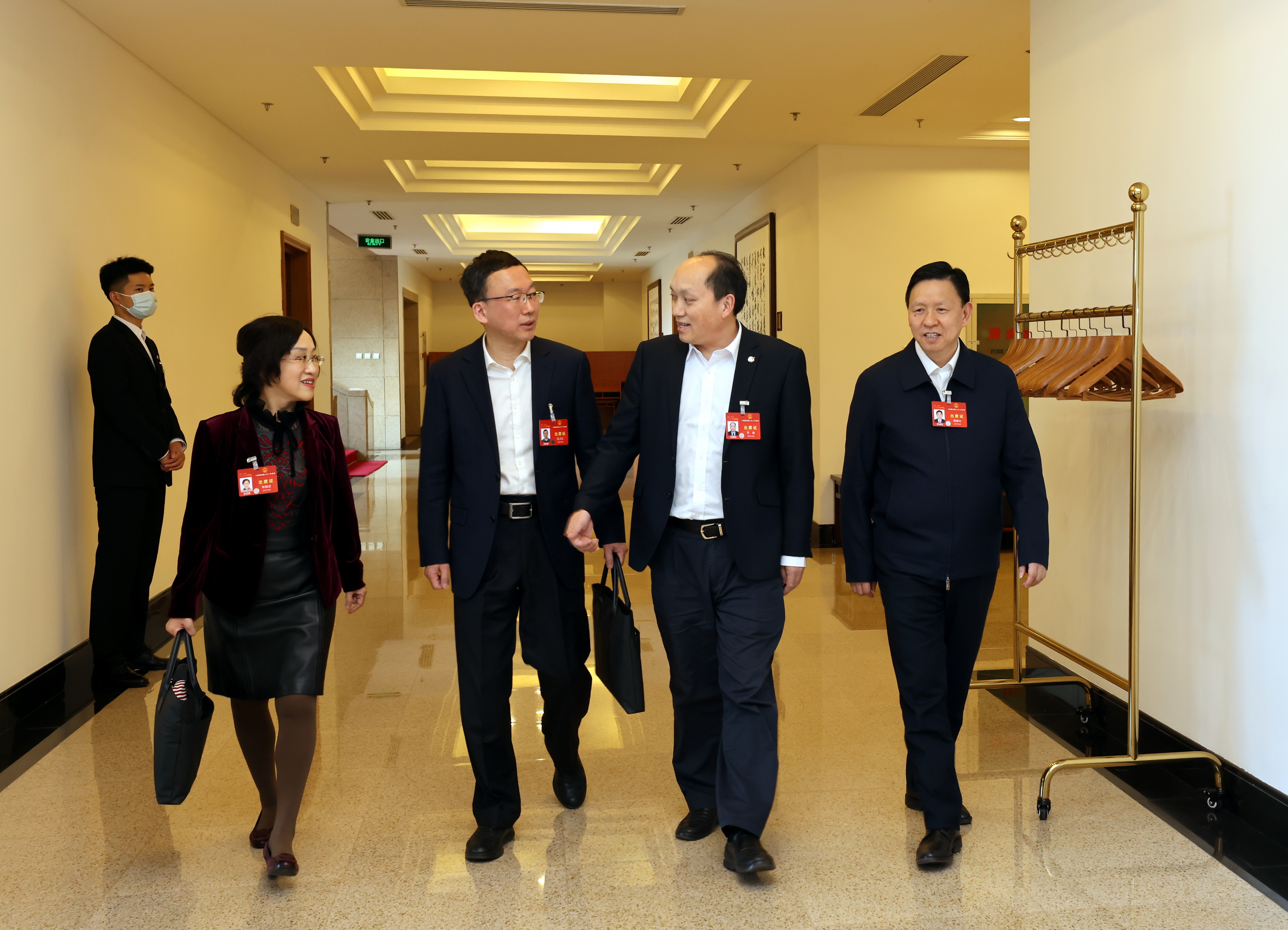 3月7日下午,陕西代表团举行小组会议,审议国务院组织法修订草案。会议开始前,代表一边步入会场一边交流研讨。左二为张卫红。