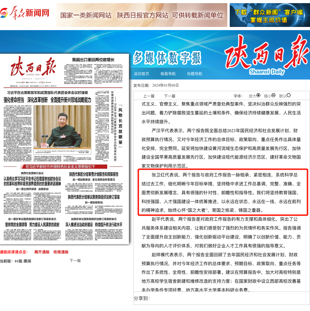 3月6日下午和7日上午,陕西代表团举行代表小组会议,审查计划报告和预算报告。会上,张卫红作了重点发言。3月7日和8日,《陕西新闻联播》和《陕西日报》分别报道了张卫红的主要发言内容。