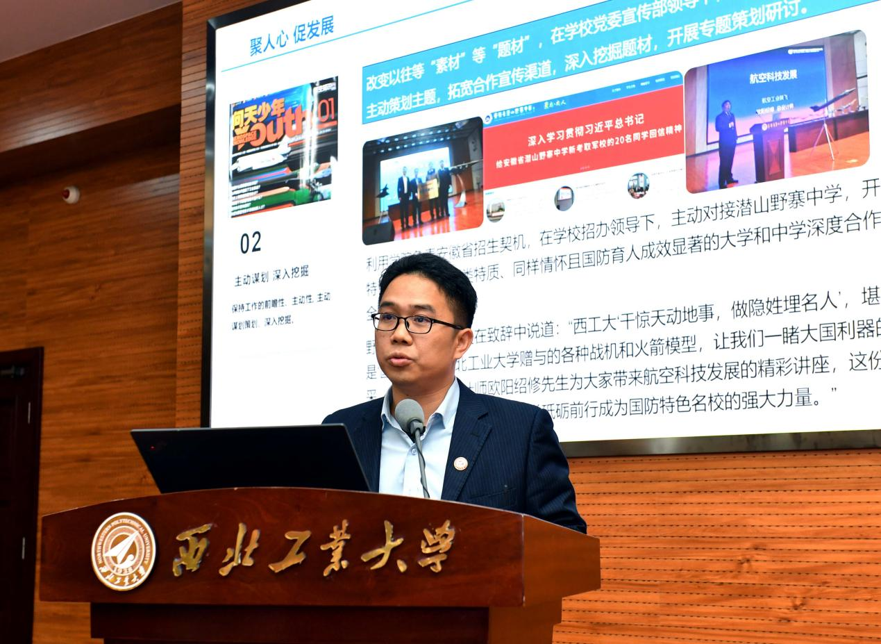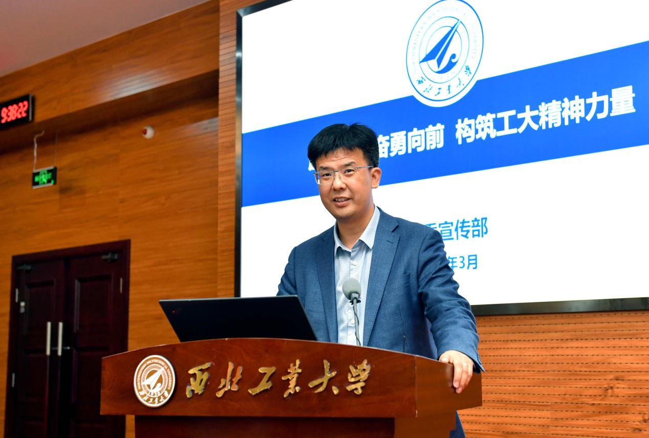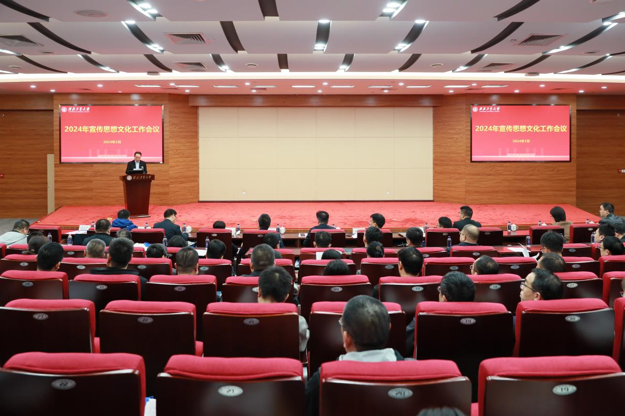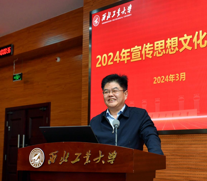 他对学校宣传思想文化工作提出了三点要求。一是要坚持以习近平新时代中国特色社会主义思想为指导,深入学习贯彻习近平文化思想,宣传好、阐释好习近平总书记重要论述的核心要义、精神实质,丰富内涵、实践要求。各单位要按照党中央和学校党委要求,做到认识到位、行动到位、水平到位,对内凝聚西工大人实现“127”目标的精神力量,对外塑造西工大“育国之栋梁、铸国之重器”的良好社会形象,为实现“天下工大、世界三航”的远景目标源源不断注入精神动能。二是要夯实主体责任,聚焦“强特色、筑高峰”做好各项工作。党委宣传部要进一步加强顶层设计、完善工作机制,紧盯中央和上级部门要求,加大对各单位工作指导和支持,在重大选题策划、教育部高校思政工作精品建设项目培育、主流媒体发声、精品文化活动和文艺创作、大思政课建设、时代新人铸魂工程等方面持续发力,产出一批标志性成果;各职能部门要围绕学校核心竞争力指标,结合本单位具体业务,主动对接、提前策划,充分展示好学校发展建设中取得的成绩和经验做法;各基层党委(党总支)要围绕“国防、三航、系统”的科研特色和“总师育人文化”的人才培养特色,挖掘培育好宣传思想文化资源,在全校营造主动宣传、善于宣传的良好氛围,进一步弘扬“总师育人文化”。三是要严格落实意识形态工作责任制,筑牢安全防线。要深刻认识“牢牢掌握党对意识形态工作领导权”的极端重要性,提升预判预警预防能力、高效处置能力,严格内容审核把关,强化对网络媒体平台建设管理,多措并举确保校园意识形态安全。