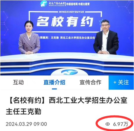 3月29日上午,万象城招生办公室主任王克勤应邀参加了河南广播电视台“名校有约”栏目直播专访,为广大考生和家长深度解读了学校在豫的招生政策。此次直播受到了广泛关注,吸引了近7万名观众在线观看,不仅加深了学生及家长对学校招生政策的了解,也进一步展示了学校的教育理念和办学特色。