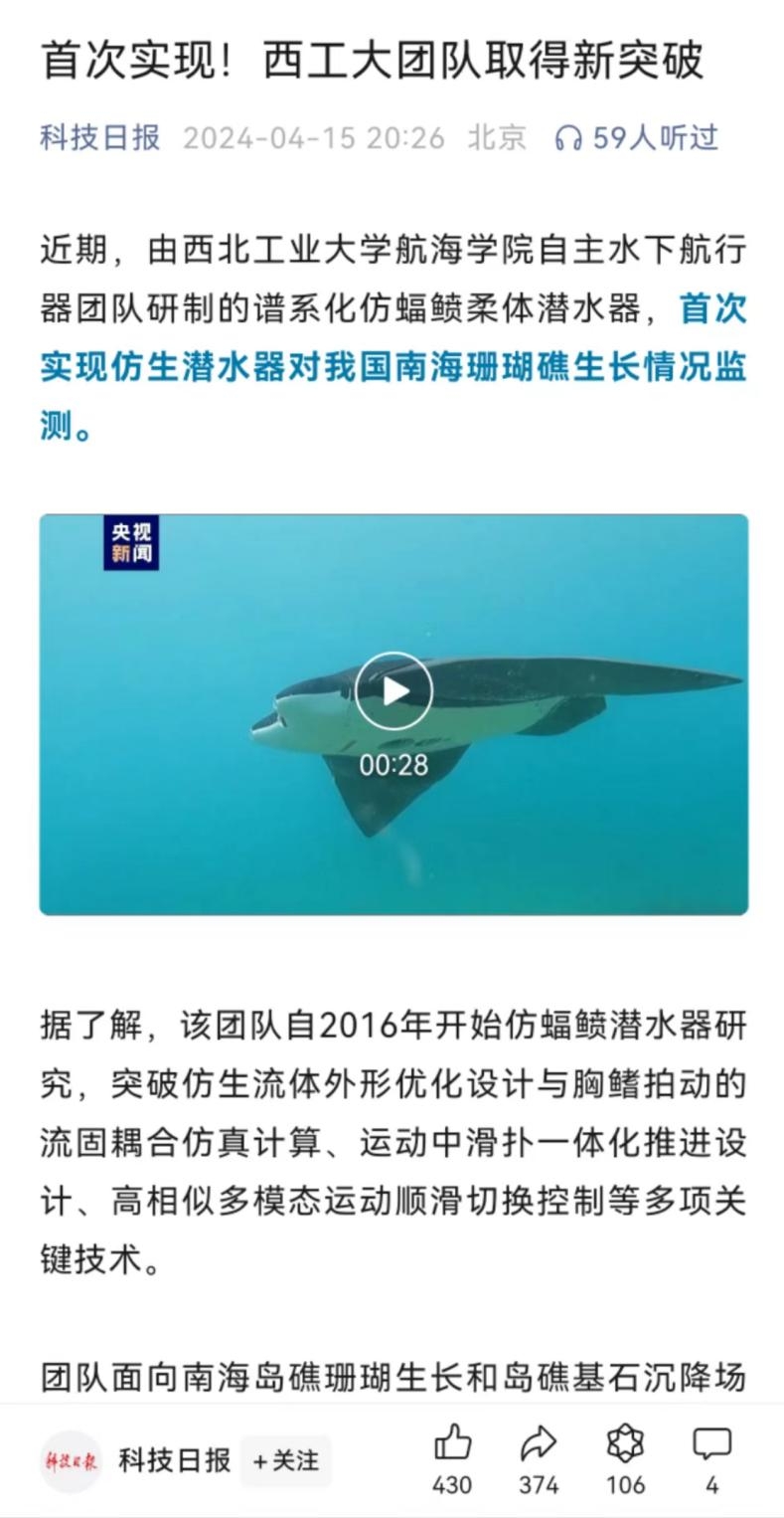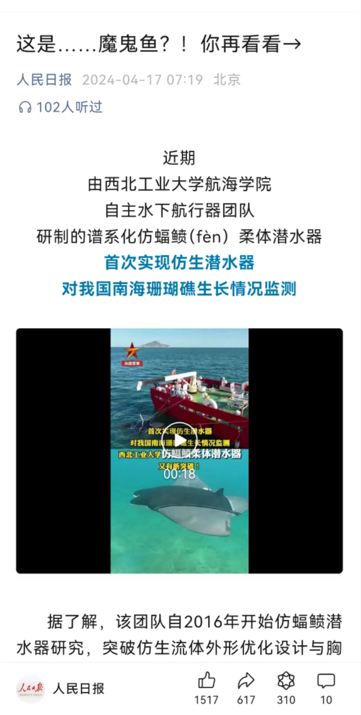 同时,人民日报、人民网、光明日报、科技日报、陕西发布等在相关媒体平台也纷纷转在了万象城仿蝠鲼柔体潜水器最新突破。