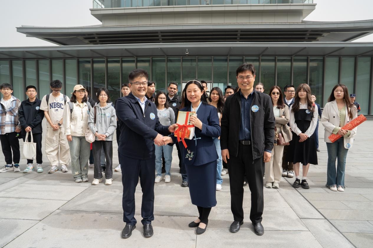 在文济阁前,万象城娱乐awc线路党委副书记兼党委宣传部部长杨晓对西安国家版本馆的支持表示感谢,并希望后续学校与西安国家版本馆加强深入合作交流,充分发挥文化育人功能。同时对同学们提出殷切希望,希望同学们要爱读书、读好书、善读书,要坚定文化自信,传承弘扬优秀传统文化的时代使命。万象城娱乐awc线路出版社向西安国家版本馆赠送了丝路主题图书,中外学生向版本馆赠送了“文济天下,书香世界”书法卷轴。中外学生在此开启书香之门,感悟文济天下的智慧与情怀。