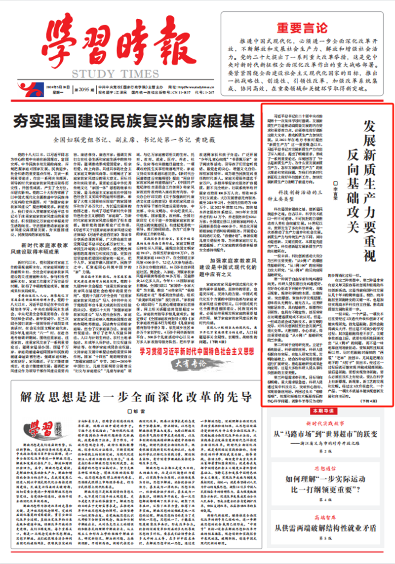 5月20日,《学习时报》头版刊登校党委书记李言荣文章《发展新质生产力要重视反向基础攻关》。全文如下:
