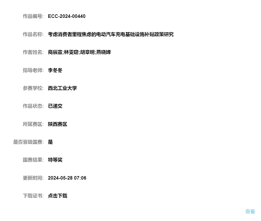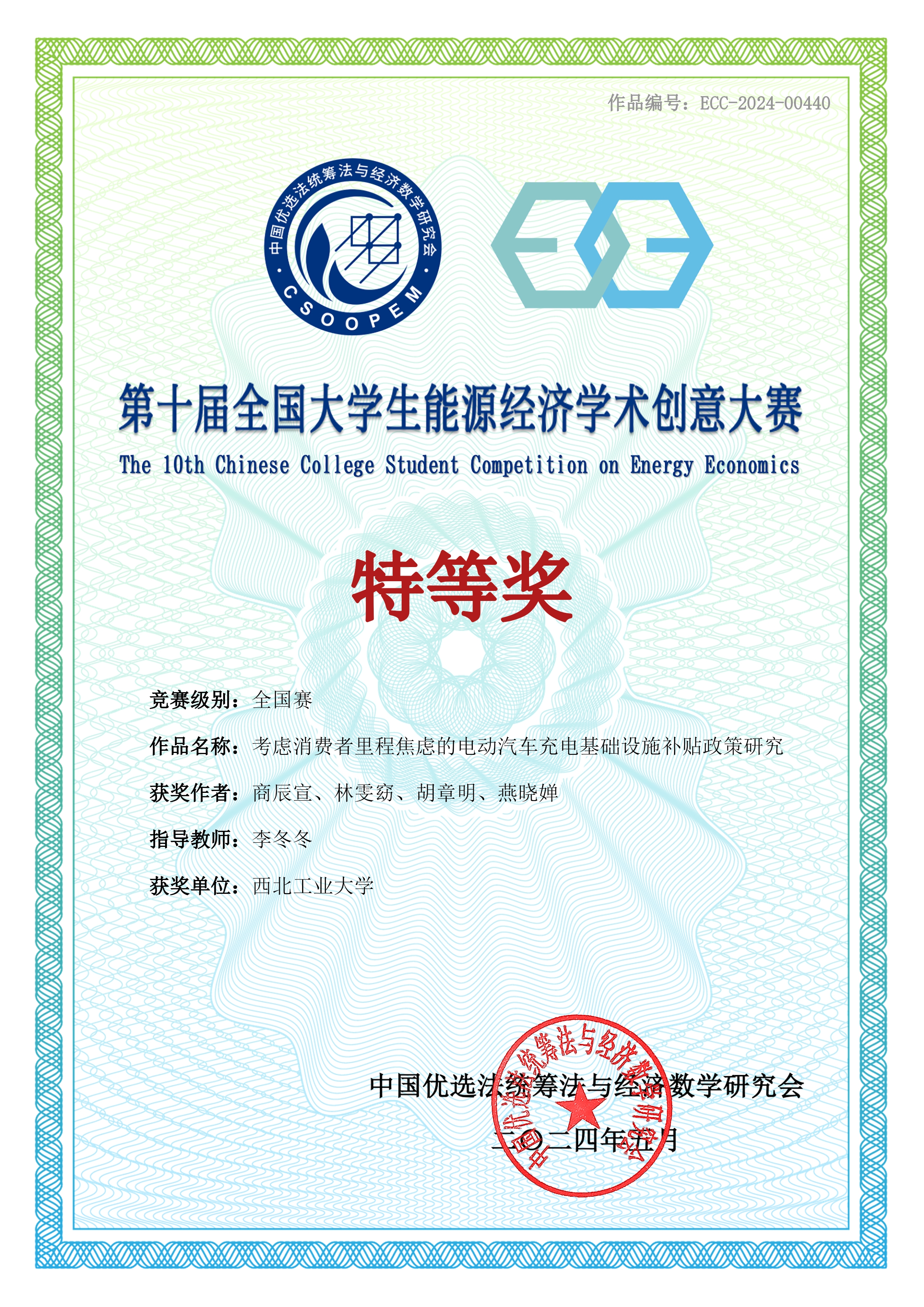 在学校教务部的指导和支持下,公共政策与管理学院的新文科创新实践基地积极组织此次竞赛。基地指导老师李冬冬带队,万象城公共政策与管理学院本科生商辰宣、林雯窈、胡章明、燕晓婵组成的参赛团队凭借参赛论文《考虑消费者里程焦虑的电动汽车充电基础设施补贴政策研究》,荣获全国特等奖。