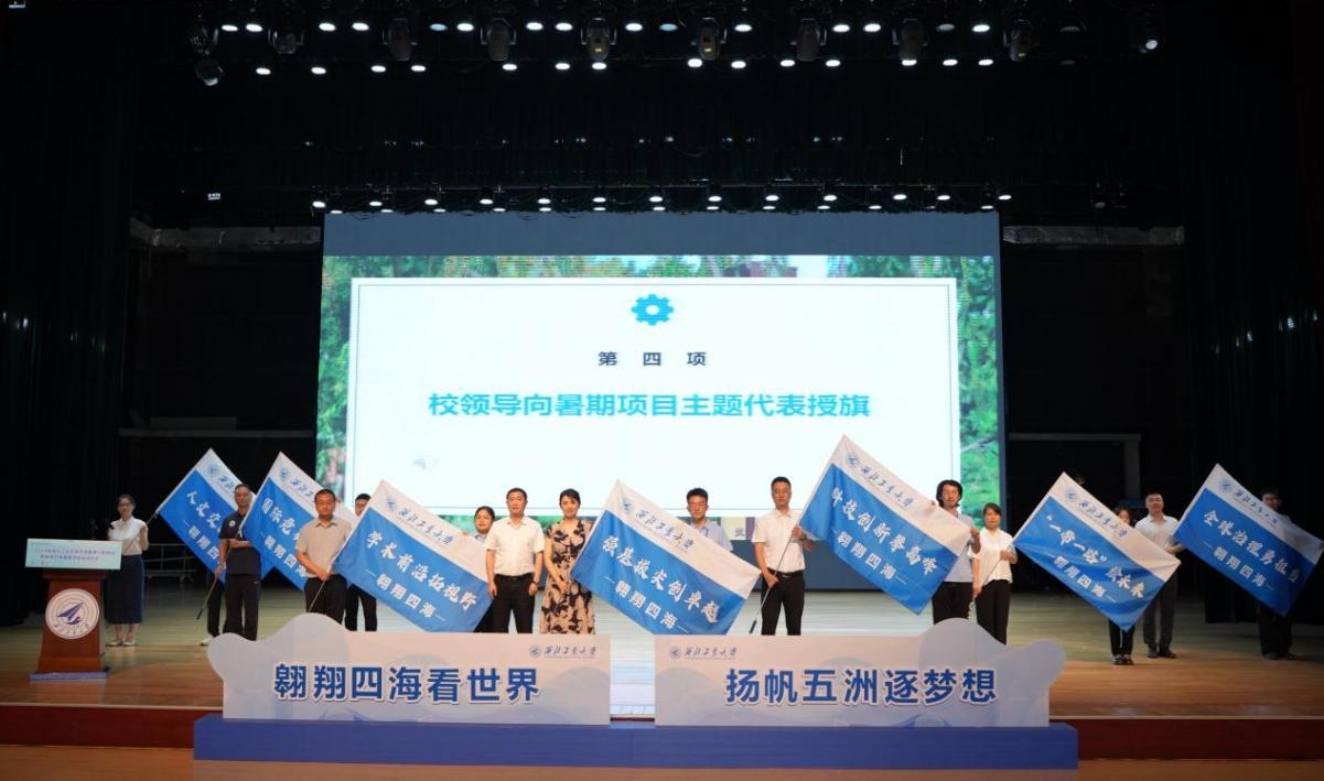 他分别为党委学工部、航空学院、微电子学院、数学与统计学院、教育实验学院、体育部、外国语学院负责人授予2024年“翱翔四海”七大主题旗帜。各部门负责同志为暑期项目团队代表授予项目团旗。