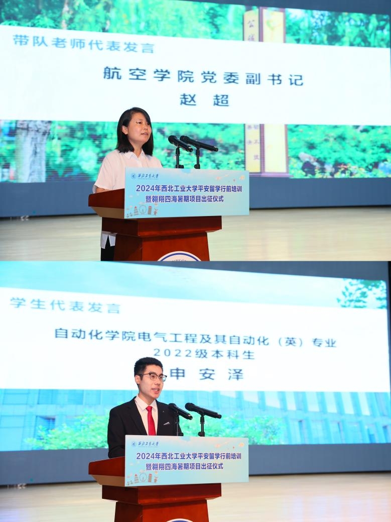 航空学院党委副书记赵超作为带队老师代表发言。她介绍到,学院高度重视学生国际视野拓展和全球胜任力提升,制定了一系列短期出国交流资助政策。学院积极组织宣讲会、证照辅导、定制课程计划等,确保项目质量。她表示,作为带队老师,必将严格履行职责,确保学生安全。