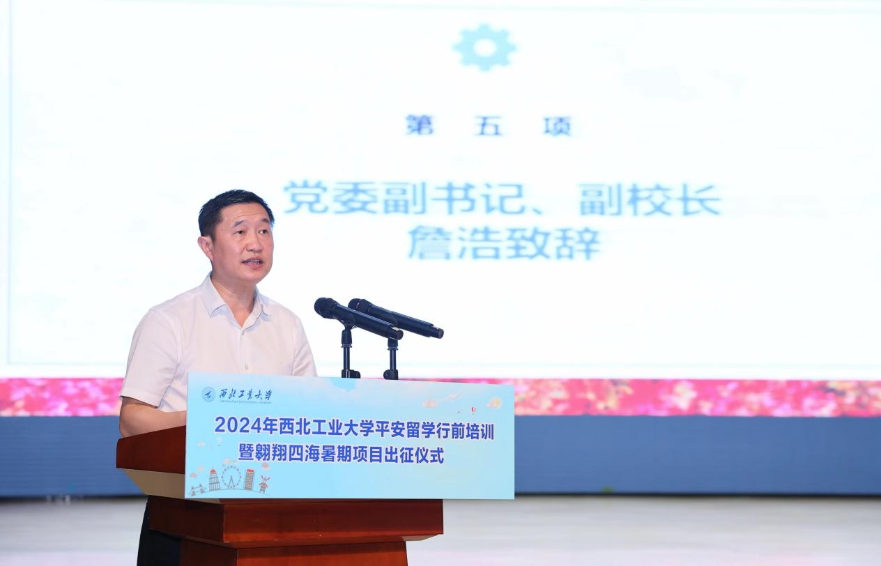 詹浩代表学校向即将踏上征途的各团队表示祝贺,并对同学们提出三点希望:一是厚植家国情怀,全面认识世界;二是欣然踏上征途,平安顺利归来;三是发扬学校校风,不断提升格局。