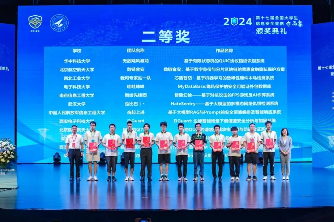 颁奖典礼由教育部高等学校网络空间安全专业教指委副主任俞能海主持。中央网信办网络安全协调局安全技术产业处副处长王博,工业和信息化部网络安全管理局网络安全处处长袁春阳,太仓市委常委、宣传部部长、统战部部长查焱等出席活动并先后致辞。教育部高等学校网络空间安全专业教学指导委员会秘书长封化民宣读比赛结果。江苏省委网信办副主任陈智,苏州市委宣传部副部长、市委网信办主任陈雪嵘以及有关高校校领导、教指委委员等出席上述活动。