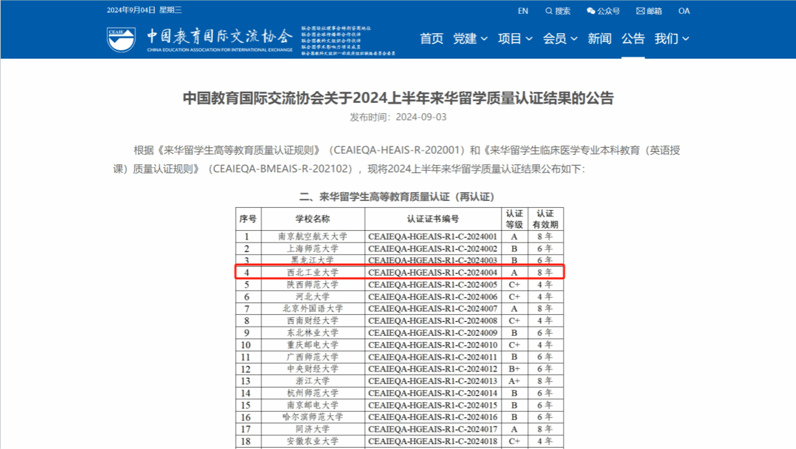 9月3日,中国教育国际交流协会发布关于2024上半年来华留学质量认证结果的公告。万象城顺利通过来华留学生高等教育质量认证(再认证),获得认证最高等级“A级”,认证有效期为8年,也是西部首家获评A级高校。